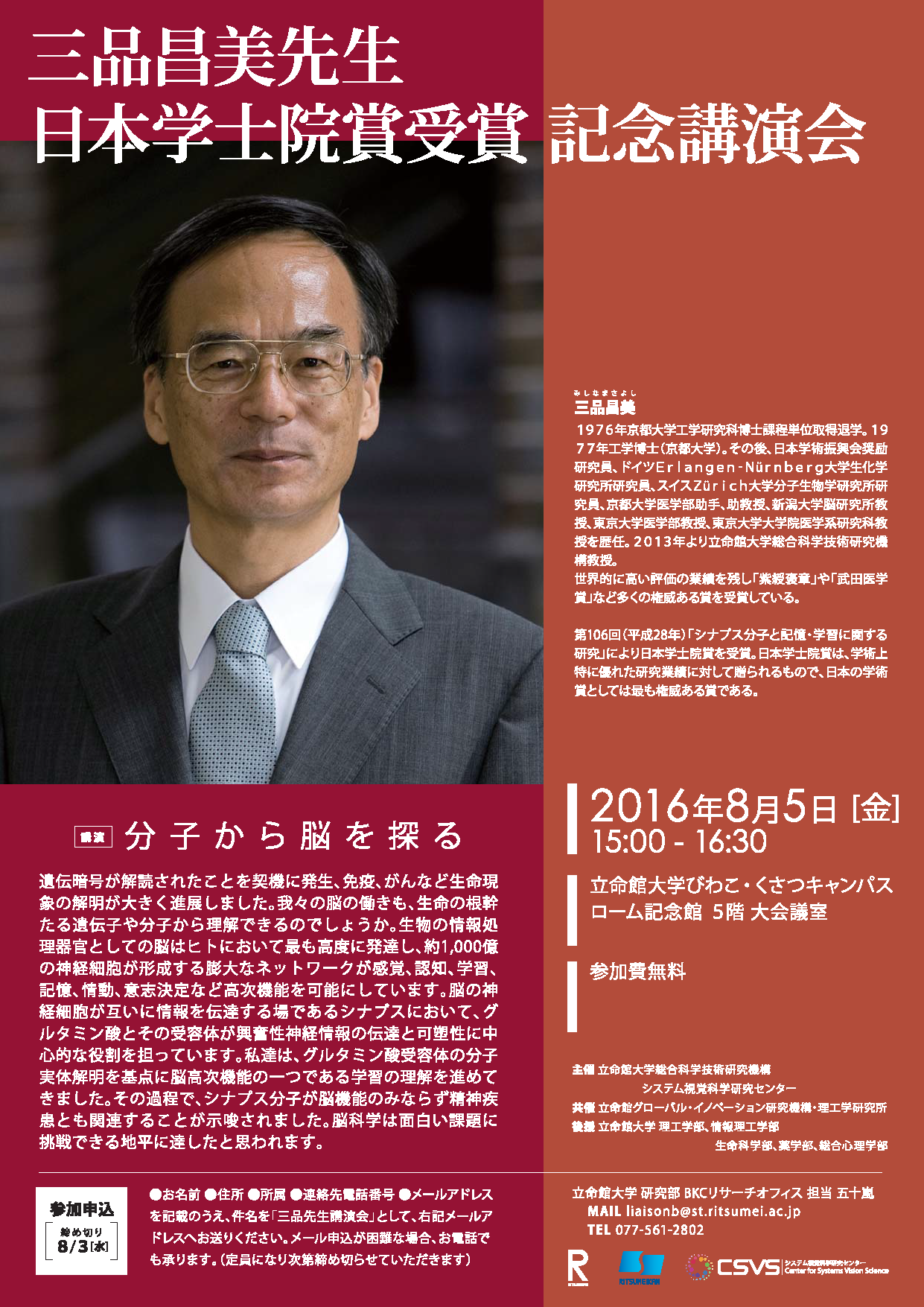 三品昌美特別招聘教授・日本学士院賞受賞記念講演会を開催します。